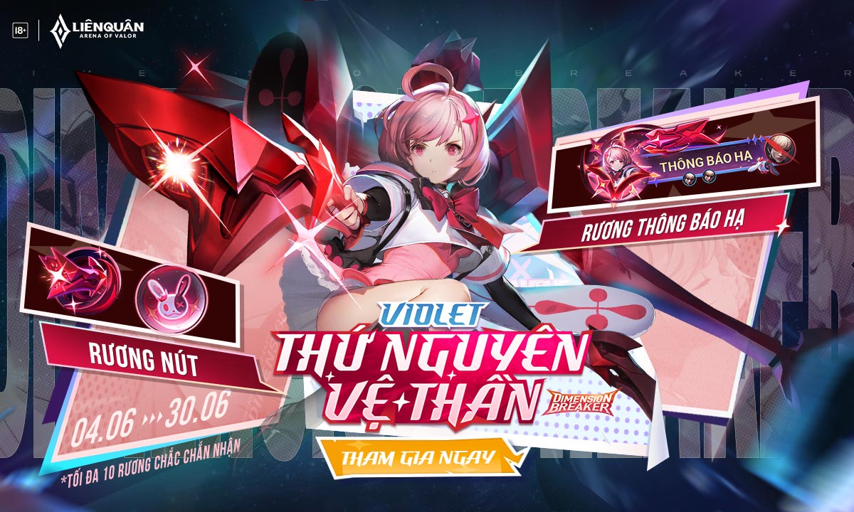 Chào các Kiện Tướng! Sự kiện Sở Hữu Violet Thứ Nguyên Vệ Thần đang khiến cộng đồng Liên Quân sôi sục không kém! Từ ngày 04/06 đến 30/06/2025, các bạn có cơ hội sở hữu trang phục bậc SSS đầu tiên của Violet với mức giá cực kỳ hấp dẫn. Chỉ với 18 QH cho mỗi lượt quay hoặc 180 QH cho 10 lượt, bạn có thể bắt đầu hành trình săn Thỏ vệ thần rồi!