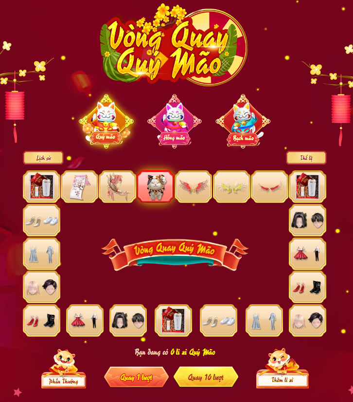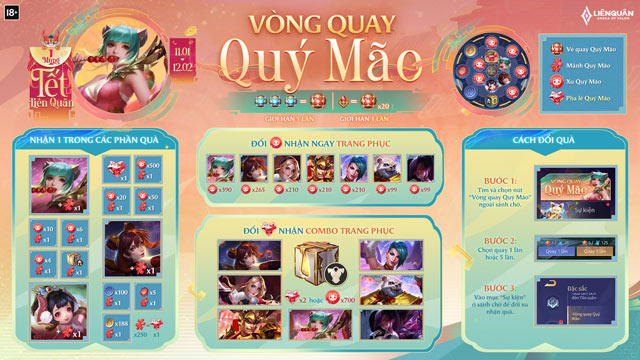 Sự kiện này sẽ diễn ra từ ngày 20.01 đến 31.01.2023, với hai loại vòng quay dành cho người chơi. Không chỉ mang tính giải trí, Vòng Quay Quý Mão còn là dịp để mọi người có thể rinh về những trang phục Tết độc đáo. Đây chính là cơ hội hiếm hoi trong năm để bạn cảm nhận không khí lễ hội.