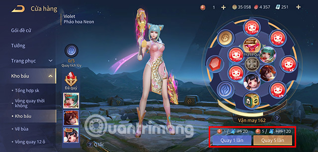 Đặc biệt, các vật phẩm trúng thưởng trong vòng quay bao gồm vàng x188 và 1 Mảnh Quý Mão, cùng nhiều phần quà hấp dẫn khác. Để tham gia, bạn chỉ cần vào Shop, tìm đến mục sự kiện và nhấn vào khung “Vòng quay Tết Quý Mão”. Đây là cơ hội tuyệt vời để bạn sở hữu những trang phục Tết độc đáo như Violet Pháo Hoa.