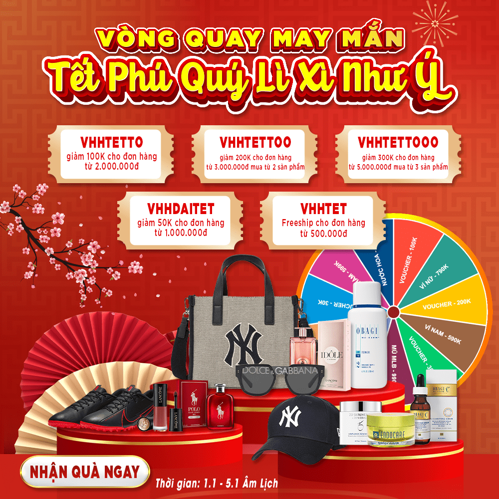 Chào đón Tết Quý Mão, Vua Hàng Hiệu mang đến cho mọi người sự kiện Vòng Quay May Mắn, diễn ra từ ngày 22 đến 26 tháng 1 năm 2023, tức là từ Mùng 1 đến Mùng 5 Tết. Đây là cơ hội tuyệt vời để người tham gia nhận những phần quà hấp dẫn hoàn toàn miễn phí. Vòng quay này không chỉ mang lại niềm vui mà còn là nhịp cầu kết nối những người yêu thích mua sắm.
